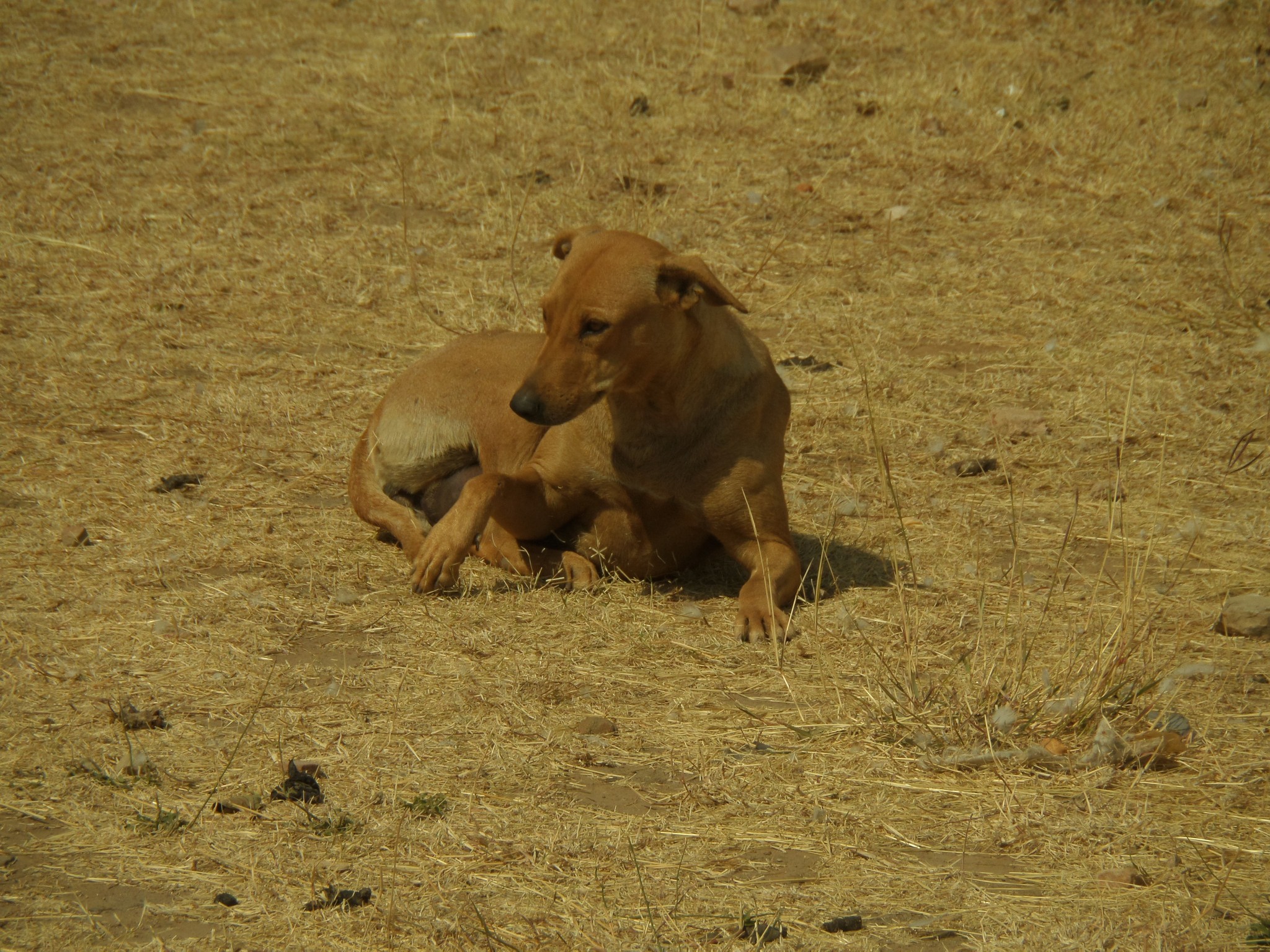 Midday had flattened the landscape into one quiet tone. The dog lay there, alert but unbothered, having already made peace with the heat and the hour.